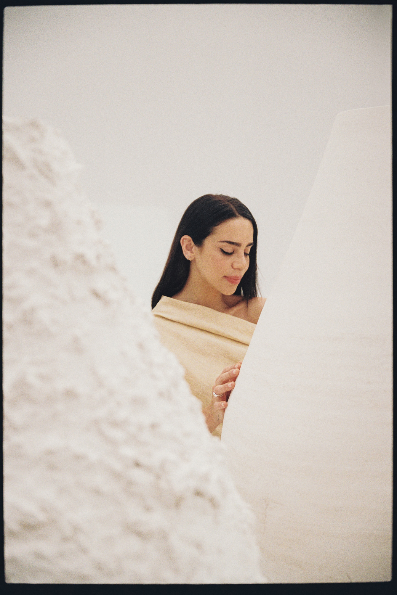 Walking among the pieces like a sculptor, her touch lingers, blending into the forms.