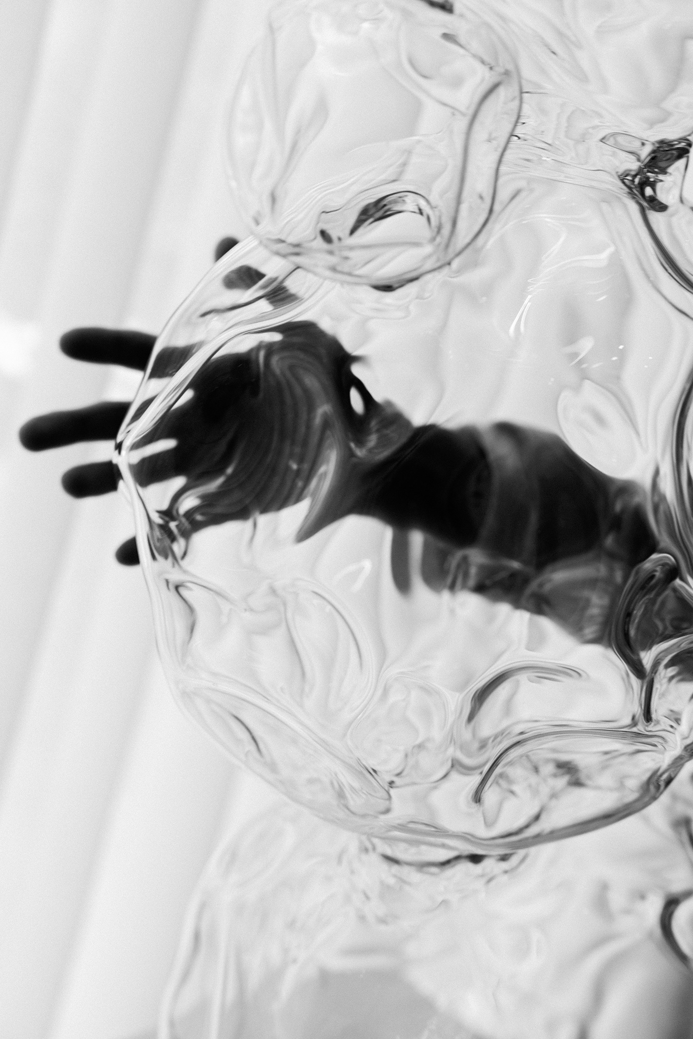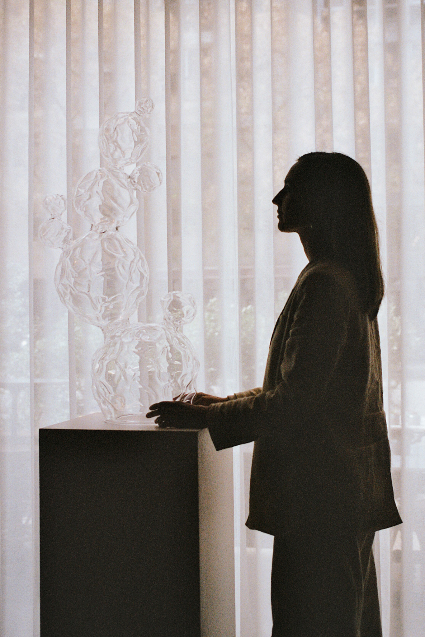 The image becomes a study of connection — the artist in relation to her piece, framed within the space that holds them both. Transparency, layering, and irregular shapes speak to her process: one of building, sensing, and letting the form emerge over time.
