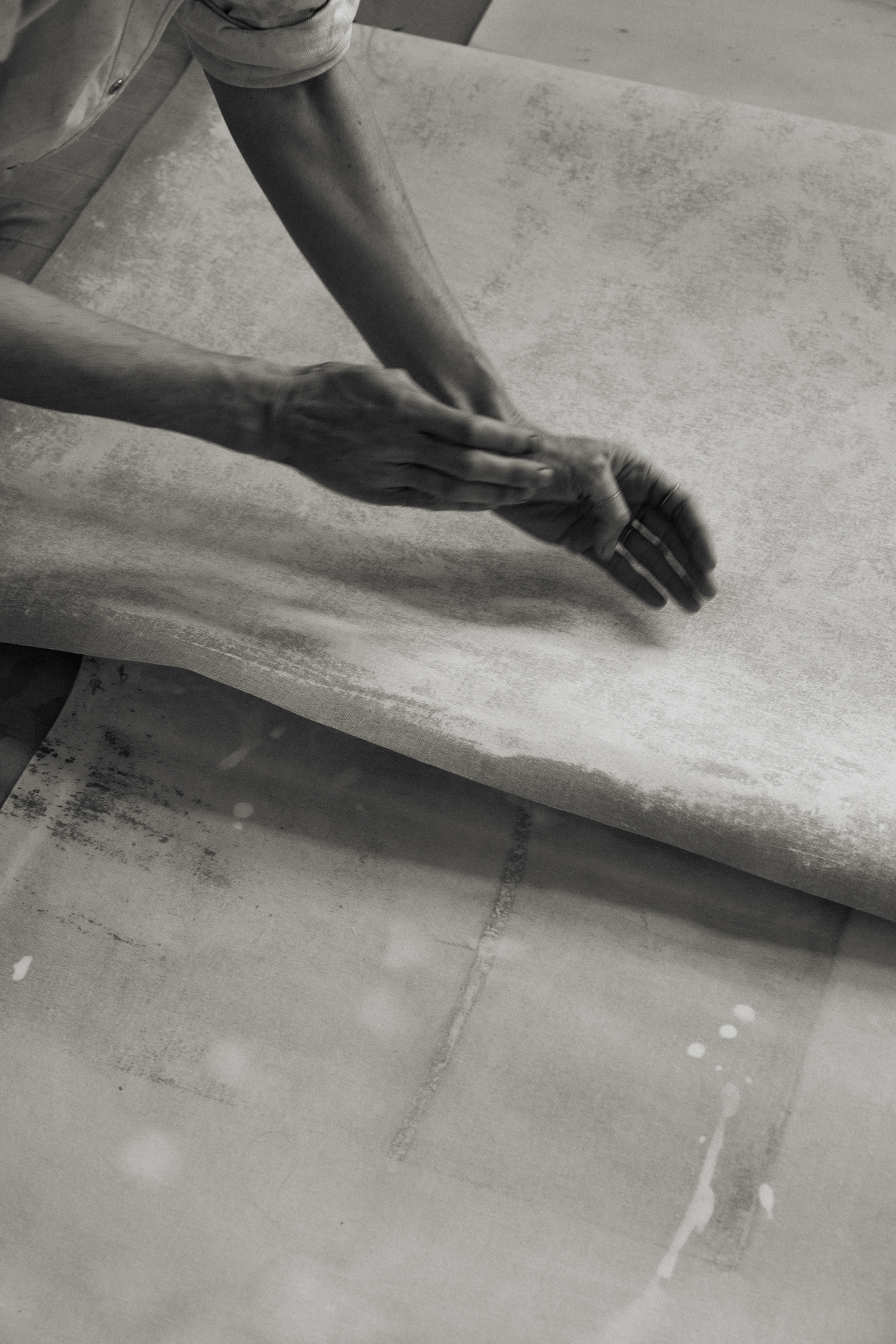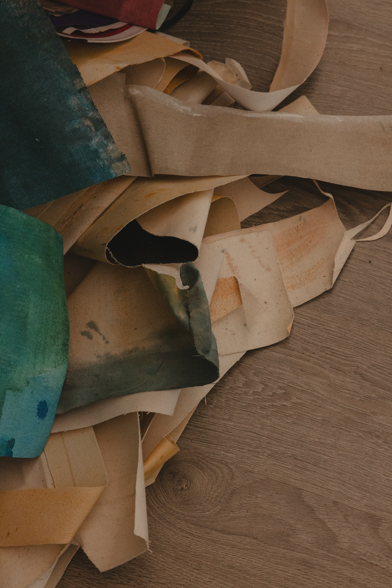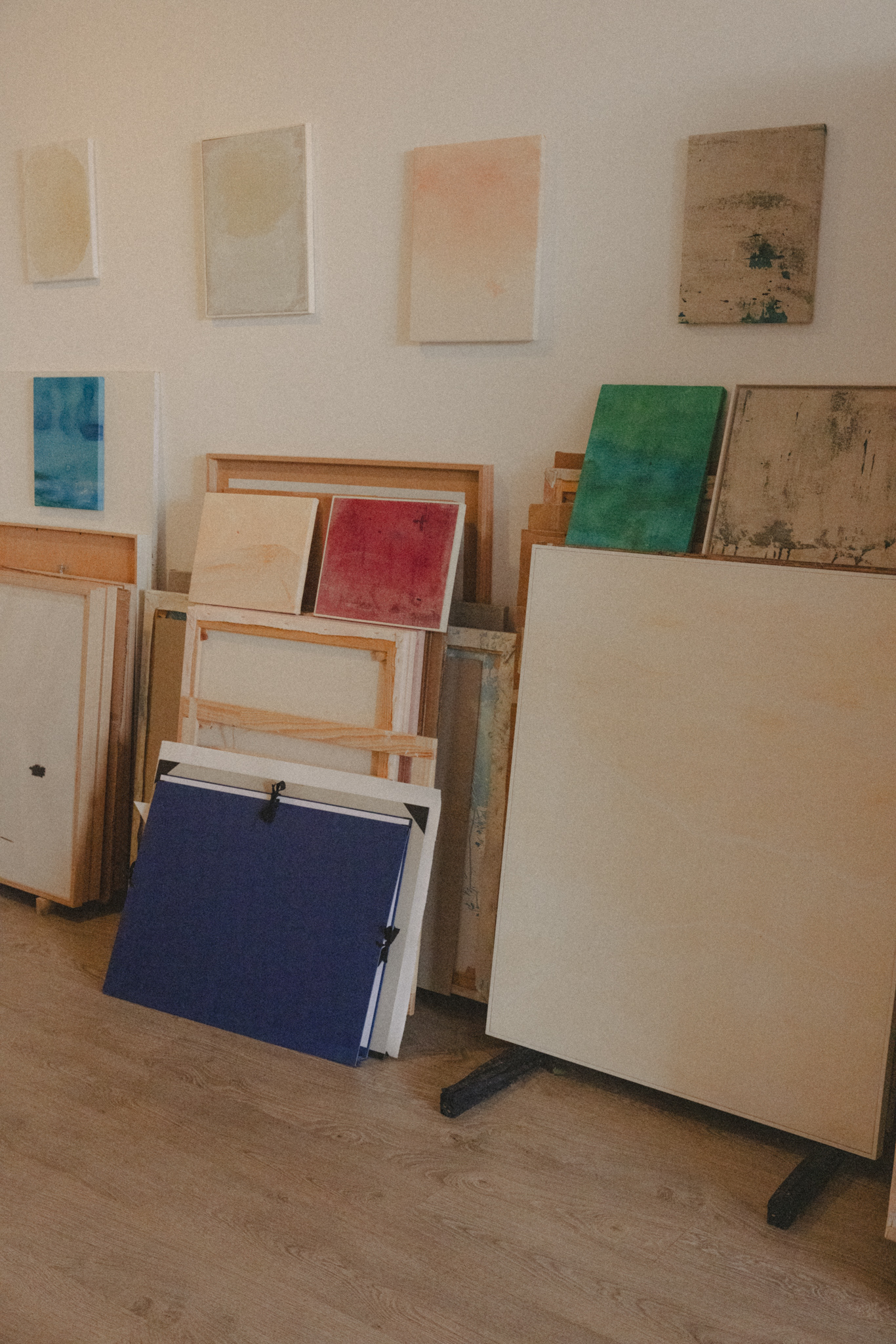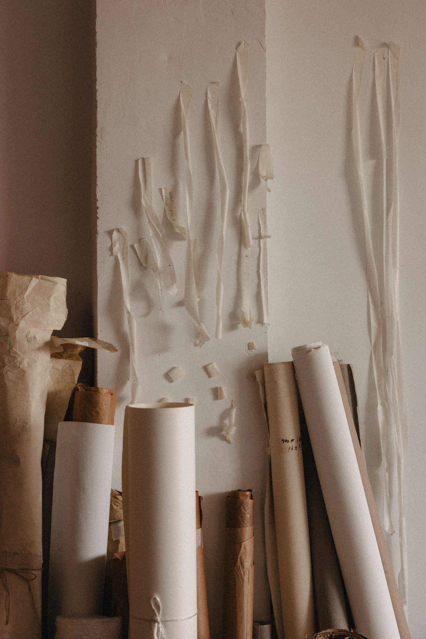 The visit felt like a quiet choreography — paper and canvas, movement and pause. Across the studio, works rested on the floor, hung from walls, loosely rolled in corners. Each one holding its own rhythm, its own weight. Mirthe’s work invites stillness. I looked, waited, listened through the lens.
